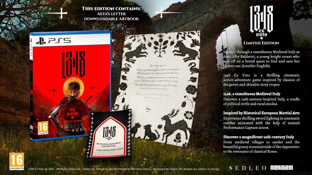 El estudio independiente italiano Sedleo y la publisher francesa Dear Villagers han anunciado su próximo juego, 1348 Ex Voto se lanzará el 12 de marzo de 2026 en PC (Steam, Epic Games Store) y PlayStation 5. Lamentablemente, la versión de Xbox anunciada previamente ha sido cancelada con el fin de centrar los esfuerzos del estudio en proporcionar la mejor experiencia posible para las plataformas de PC y PlayStation.