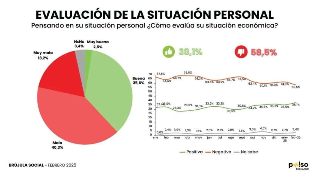 El estudio corresponde al mes de febrero corriente y revela la alarmante cifra de un 59% de los encuestados que ha dejado de comprar comida y bebidas, mientras que un 39% decidió dejar de pagar algún impuesto o servicio este mes.