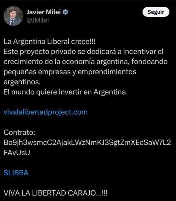 El viernes en la tarde Milei promocionó en sus cuentas de redes sociales una criptomoneda llamada $LIBRA como parte de un proyecto llamado “vivalalibertadproject.com”, que hace alusión directa al eslogan de campaña de Javier Milei “¡Viva la libertad, carajo!”. De hecho la página web está aún al aire y allí se explica y se relaciona el token (criptomoneda) $LIBRA con el presidente argentino.