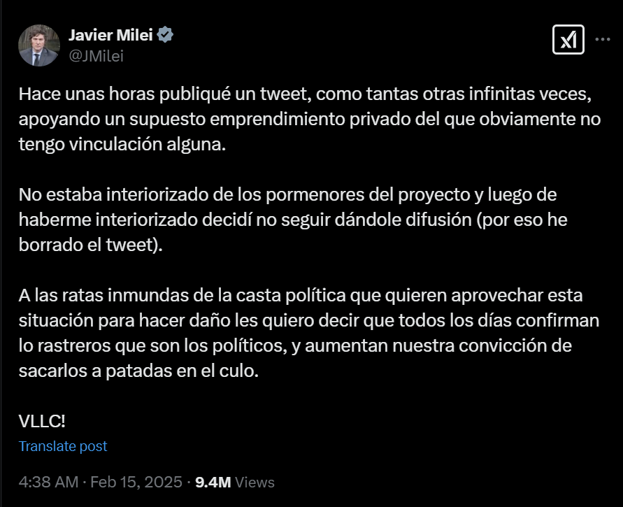 Muchos de quienes creen en Milei sencillamente compraron la criptomoneda, confiando en que se trataba de un proyecto de inversión privado completamente seguro porque, claro, estaba siendo respaldado por el presidente de Argentina, que además es economista y el que ha prometido sacar a Argentina de la crisis. Este impulso dado por Milei en la promoción del token hizo que su precio subiera mucho en poco tiempo y muchos terminaron comprando por un valor costoso. Pero, rápidamente, ese mismo día, ocurrió el desplome: hubo una ola de ventas de la criptomoneda y su precio se vino a cero. Milei borró sus posts en redes sociales y publicó que no había revisado bien la cosa y que decidió “no seguir dándole difusión”.