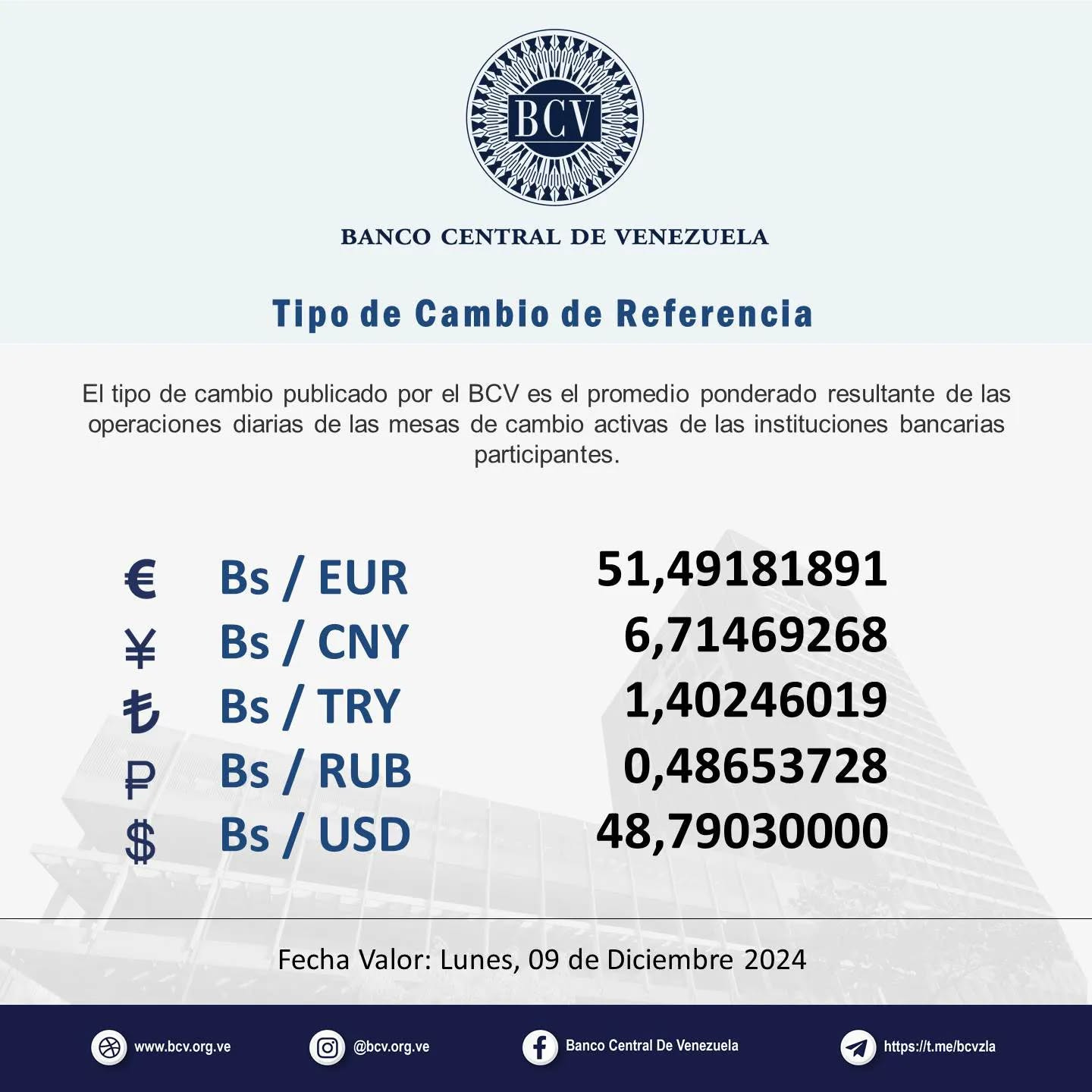 El Banco Central de Venezuela informó que las mesas de cambio de ayer arrojaron un promedio de 48,79 bolívares por dólar. Recuerda que esta es la única tasa válida para cualquier transacción del día de hoy.