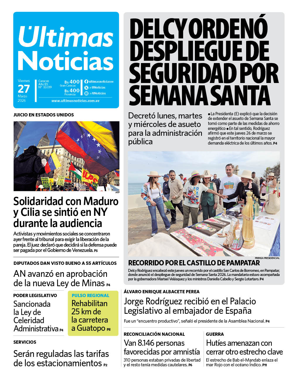 Feliz fin de semana y pendiente. Recuerda que para mantenerte al día, todo el día, lo único que tienes que hacer es conectarte con ultimasnoticias.com.ve, (@UNoticias) en X, TikTok, Threads, Facebook, Instagram, LinkedIn y también en nuestro canal de Telegram (@UNoticias). Te invito además a ¡leer el diario impreso! Busca ya tu ejemplar de Últimas Noticias.