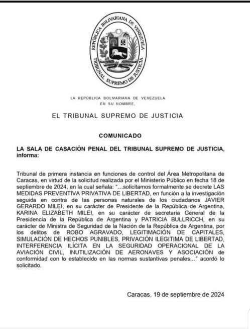 El tribunal de primera instancia en funciones de control del Área Metropolitana de Caracas acordó las medidas privativas de libertad en contra del presidente de Argentina, Javier Milei; la secretaria General de la Presidencia de Argentina, Karina Milei, y la ministra de Seguridad de la Nación de ese país, Patricia Bullricch.
