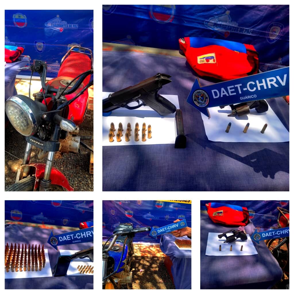 En el procedimiento los agentes recuperaron dos armas de fuego: una pistola marca: PX4 Storm con los seriales desvastados y un revólver Airweight calibre 38 mm, 17 municiones calibre 9 mm, tres municiones calibre 38 mm, 98 municiones para fusiles calibre 7.62 x 51 y dos motos.