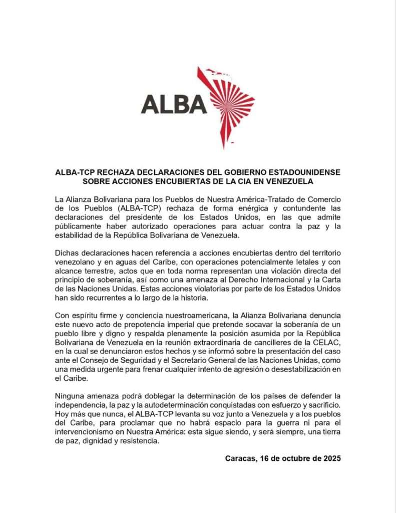 La Alianza Bolivariana para los Pueblos de Nuestra América-Tratado de Comercio de los Pueblos (ALBA-TCP) rechazó las declaraciones del Gobierno estadounidense sobre acciones encubiertas de la CIA en Venezuela.