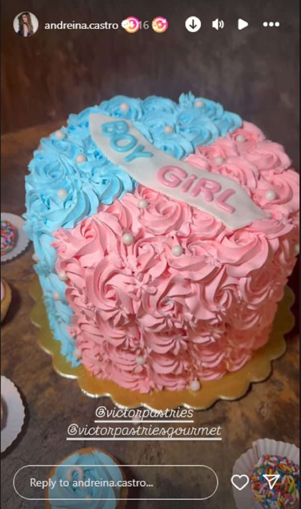 Andreína Castro igualmente aprovechó la publicación para agradecer, en nombre también de su esposo, al equipo de decoración, efectos especiales, fotografía y catering (con una torra bicolor en rosa y azul) que la ayudaron a crear el ambiente perfecto para celebrar junto a sus familiares y amigos cercanos.
