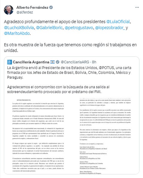 Es imposible dejar de destacar un evento tan inusual como el siguiente: el gobierno de Argentina envió al presidente de Estados Unidos, Joe Biden, una carta firmada por seis presidentes de países latinoamericanos para pedirle que apoye a Buenos Aires en el intento de negociación con el Fondo Monetario Internacional (FMI) para revisar los acuerdos referidos al pago de la enorme deuda que el país tiene con el organismo. La carta está firmada por: Lula Da Silva, de Brasil; Andrés M. López Obrador, de México; Gustavo Petro, de Colombia; Luis Arce, de Bolivia, Gabriel Boric, de Chile; y Mario A. Benítez, de Paraguay. En el documento se destaca que la fuerte y extensa sequía que ha padecido Argentina ha deteriorado de tal manera los ingresos nacionales que el país puede verse seriamente comprometido si sigue el ritmo de pago de la deuda como hasta ahora. Y es evidente el reconocimiento implícito de que Washington tiene el poder de incidir sobre el FMI como socio mayoritario. Habrá que ver si en la Casa Blanca atienen el llamado.