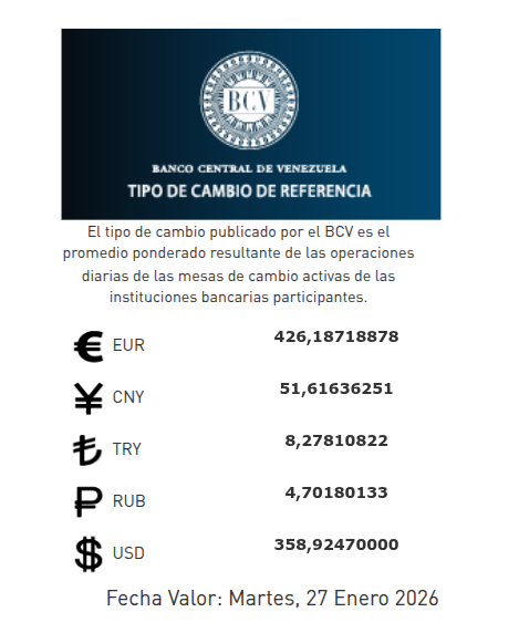 El Banco Central de Venezuela publicó en sus redes sociales al cierre de la jornada de este lunes 26 de enero de 2026, el dólar se cotizará en 358,92 bolívares con fecha valor martes 27 de enero de 2026.