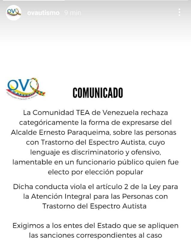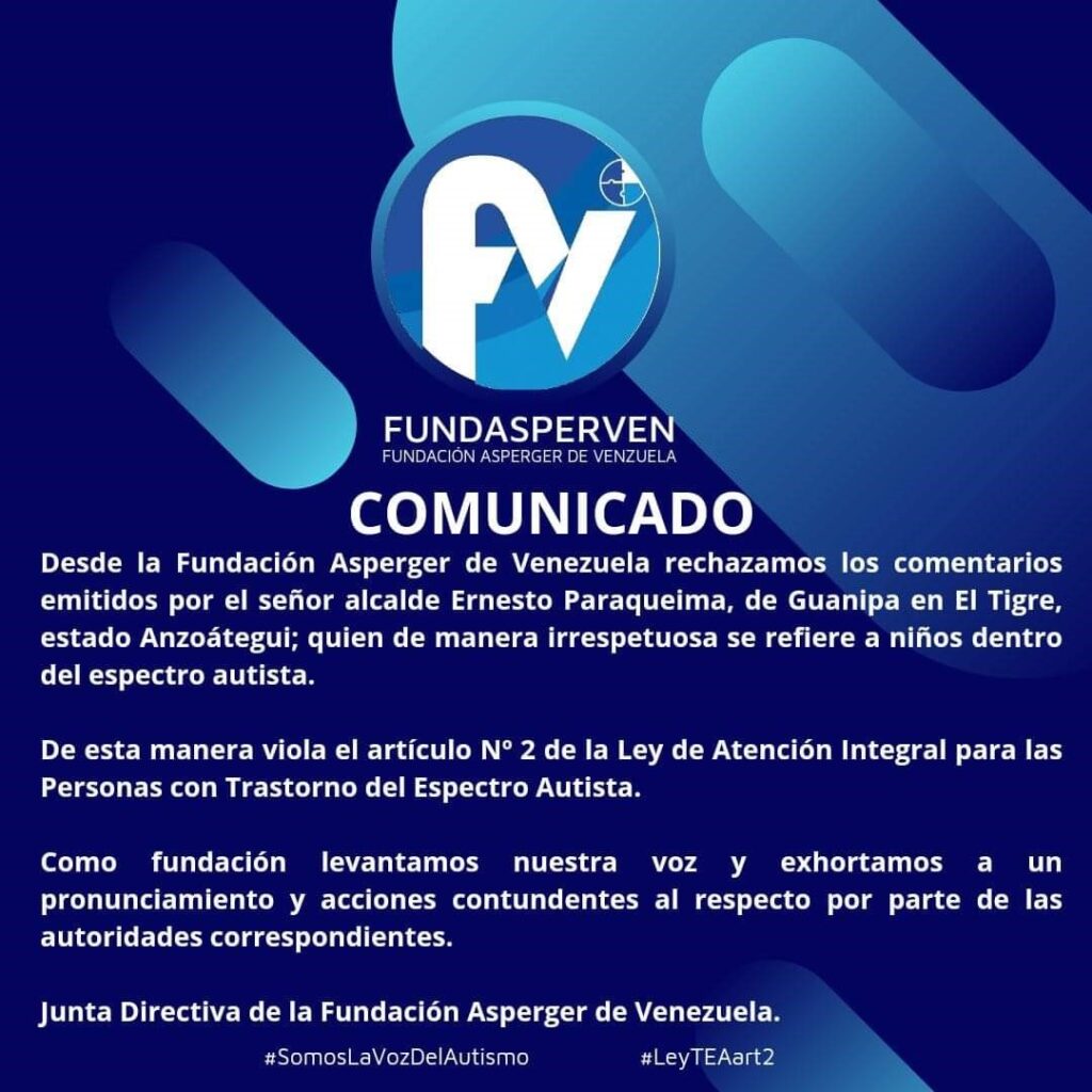 “Desde la Fundación Asperger rechazamos los comentarios emitidos por el señor alcalde Ernesto Paraqueima, de Guanipa en El Tigre, estado Anzoátegui; quién de manera irrespetuosa se refiere a niños dentro del espectro autista”.