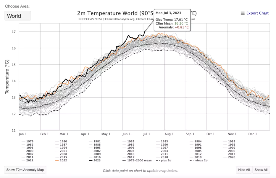 La temperatura media mundial del pasado lunes fue de 17,01 °C, superando el anterior récord de 16,92°C de agosto de 2016, año más caluroso desde que existen mediciones.