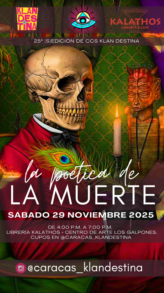 Este próximo sábado 29 de noviembre, de 4:00 a 7:00 pm, la Librería Kalathos en el Centro de Arte Los Galpones será el escenario de la vigésimo quinta edición de Caracas Klandestina, un encuentro cultural que en esta ocasión se dedicará a explorar “La poética de la muerte”.