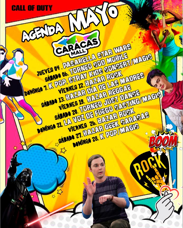 Durante el mes de mayo el Caracas Mall prepara eventos especiales para grandes y pequeños, como una celebración especial del Star Wars Day el jueves cuatro de mayo, un torneo del videojuego Call of Duty Mobile el seis de mayo, una tarde K-Pop el domingo siete de mayo, un gran Bazar de las Madres Empoderadas el 13 de mayo y muchas más actividades todos los fines de semana.