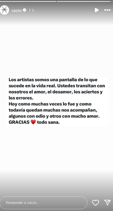 “Los artistas somos una pantalla de lo que sucede en la vida real. Ustedes transitan con nosotros el amor, el desamor, los aciertos y los errores. Hoy como muchas veces lo fue y como todavía quedan muchas nos acompañan, algunos con odio y otros con mucho amor. Gracias todo sana”, señaló.