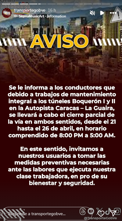 Las autoridades del ministerio de Transporte informan a los conductores que debido a trabajos de mantenimiento integral a los túneles Boquerón I y II en la Autopista Caracas – La Guaira, se llevará a cabo el cierre parcial de la vía en ambos sentidos, desde el 21 hasta el 26 de abril, en horario comprendido de 8:00 pm a 5:00 am.