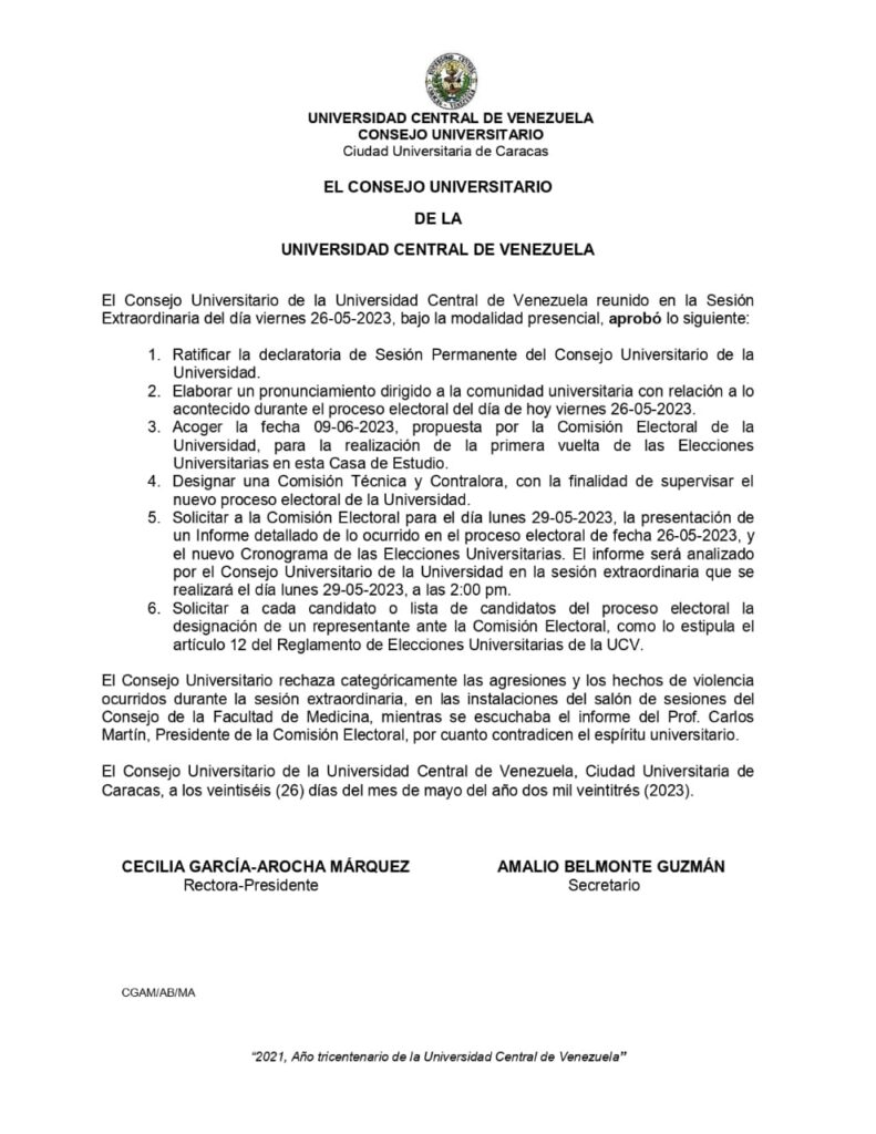 Tras la reunión extraordinaria del Consejo Universitario de la Universidad Central de Venezuela del viernes, tras el fracaso de las elecciones de autoridades universitarias, la instancia decidió crear una comisión de apoyo técnico y contraloría que supervisará el desarrollo de los próximos comicios.
