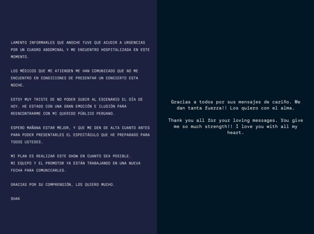 “Lamento informarles que anoche tuve que acudir a urgencias por un cuadro abdominal y me encuentro hospitalizada en este momento. Los médicos que me atienden me han comunicado que no me encuentro en condiciones de presentar un concierto esta noche. Estoy muy triste de no poder subir al escenario el día de hoy. He estado con una gran emoción e ilusión para reencontrarme con mi querido público peruano”, dijo la artista en otra historia.