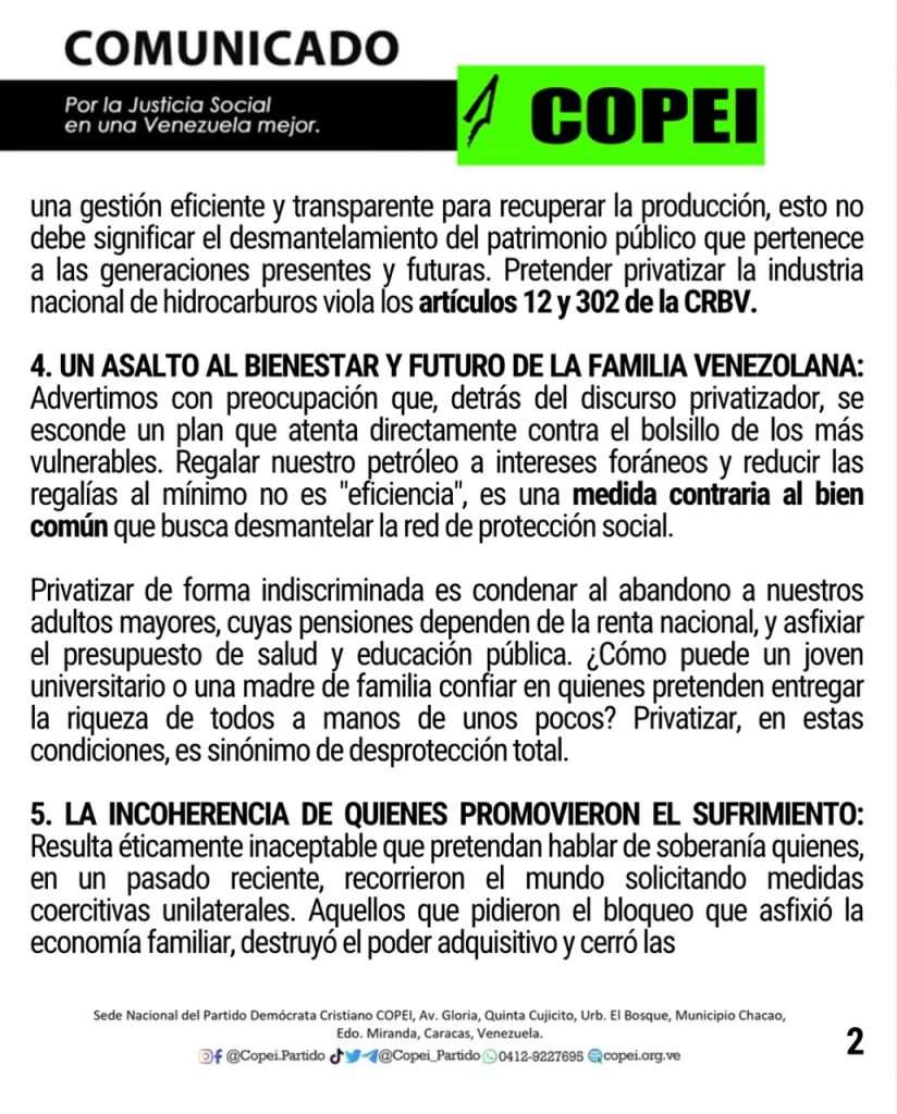 - Rechazo absoluto a la privatización: COPEI rechaza categóricamente cualquier proyecto que contemple la venta o entrega total de los activos estratégicos de nuestra industria de hidrocarburos. Consideramos que esta ruta contradice los principios de justicia social y el destino universal de los bienes.