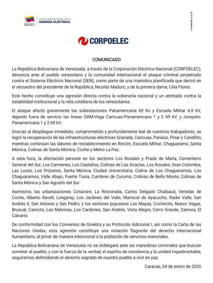 La República Bolivariana de Venezuela, a través de la Corporación Eléctrica Nacional (Corpoelec), denuncia ante el pueblo venezolano y la comunidad internacional el ataque criminal perpetrado contra el Sistema Eléctrico Nacional (SEN), como parte de una maniobra planificada que derivó en el secuestro del presidente de la República, Nicolás Maduro, y de la primera dama, Cilia Flores.