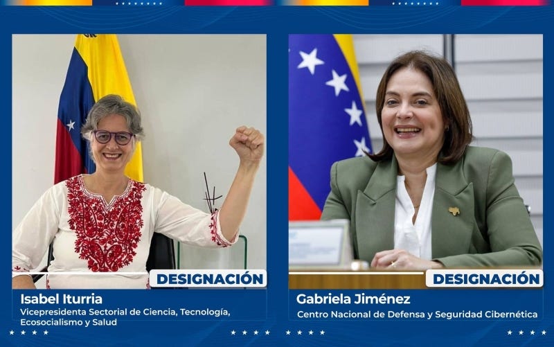 En la noche, la presidenta encargada Delcy Rodríguez anunció la designación de la Dra. Isabel Iturria como vicepresidenta Sectorial de Ciencia, Tecnología, Ecosocialismo y Salud y de la ministra Gabriela Jiménez como directora del Centro Nacional de Defensa y Seguridad Cibernética.