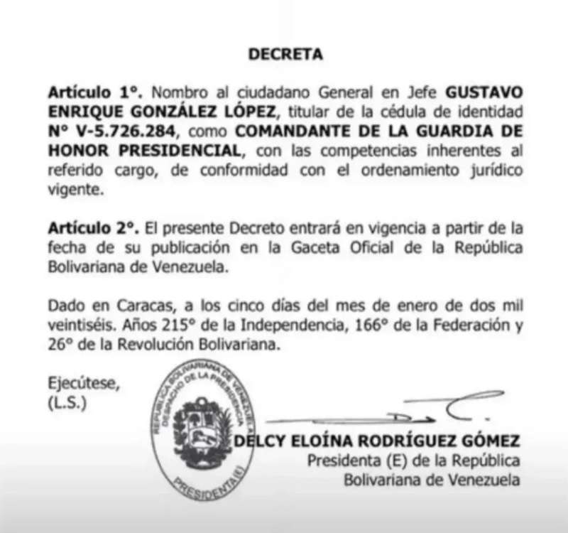 La presidenta encargada Delcy Rodríguez designó, mediante decreto, al general en jefe Gustavo Enrique González López como nuevo comandante de la Guardia de Honor Presidencial.