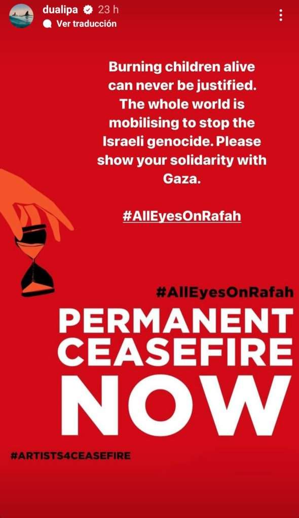 En un emotivo mensaje compartido en sus redes sociales, Dua Lipa se refirió a la imagen viral que circula con el lema “All Eyes On Rafah”. La superestrella escribió: “Quemar niños vivos nunca puede ser justificado. Todo el mundo se está movilizando para detener el genocidio israelí. Por favor, muestra tu solidaridad con Gaza”.