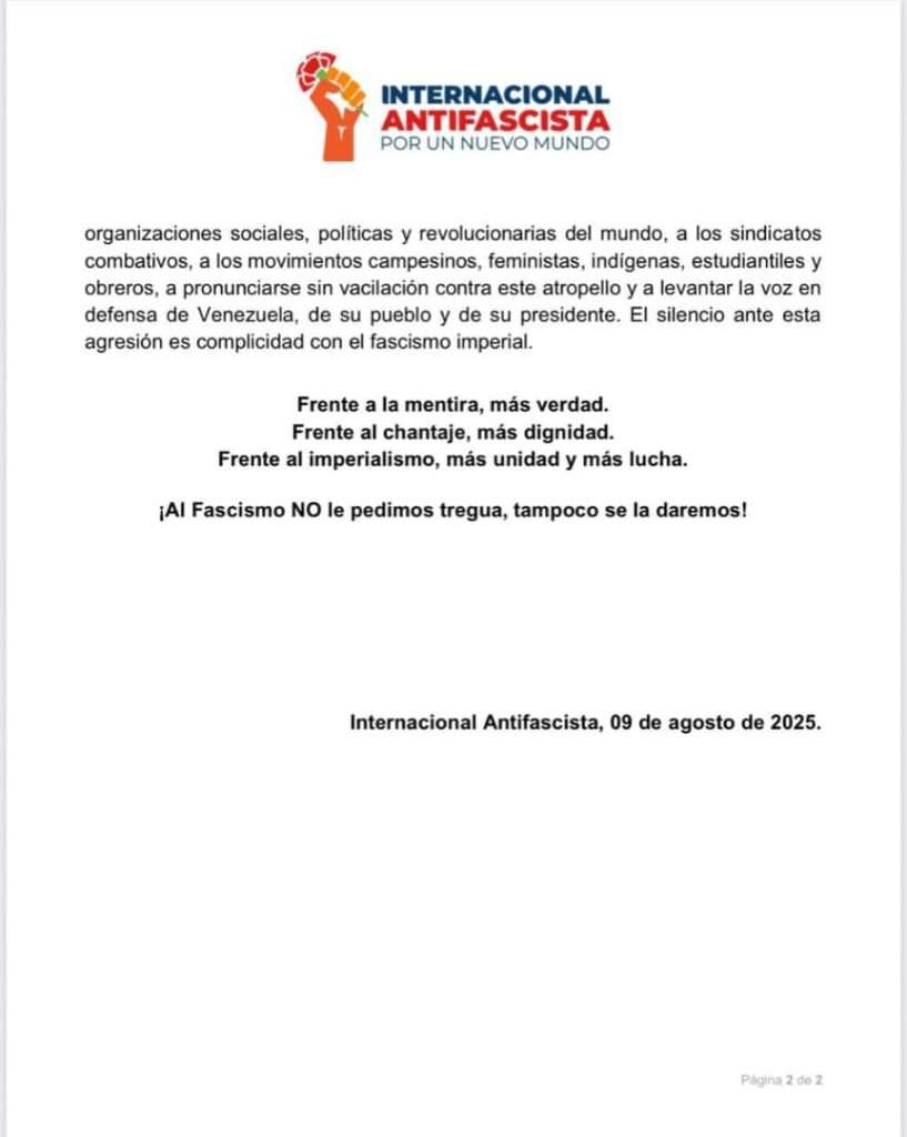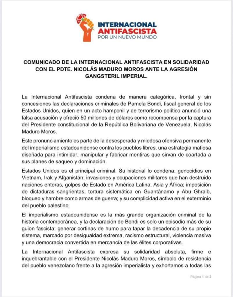 La Internacional Antifascista emitió un comunicado condenando las falsas acusaciones que hiciera recientemente el Gobierno de Estados Unidos a través de la fiscal general Pam Bondi, quien informó sobre el aumento de una recompensa por información que conduzca a la detención del presidente Nicolás Maduro.