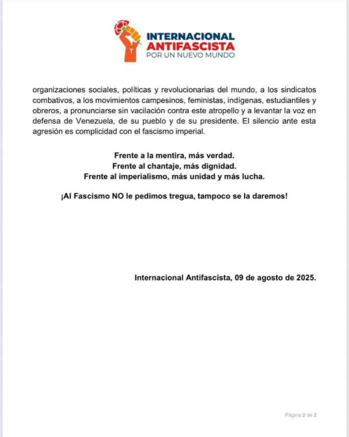 En ese sentido, la Internacional Antifascista expresó su apoyo absoluto e inquebrantable al jefe de Estado venezolano y, aseguro, que Estados Unidos tiene en su historial una larga data de invasiones y ocupaciones militares que lo convierten en «principal criminal», ante el mundo.
