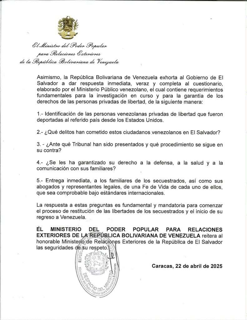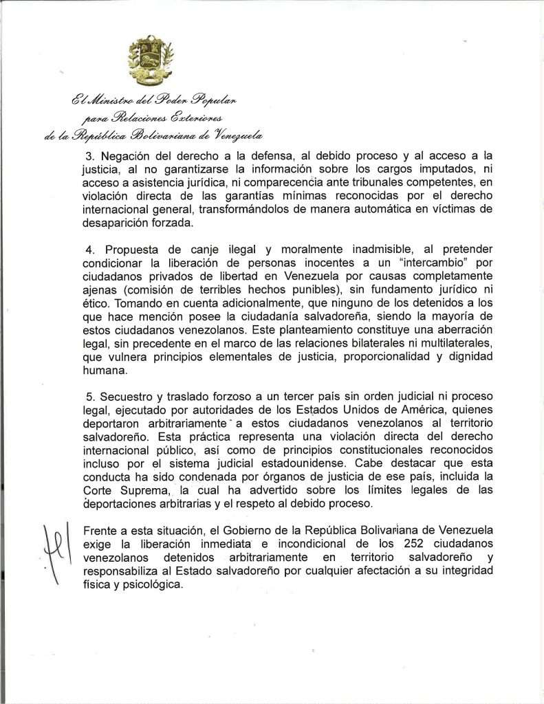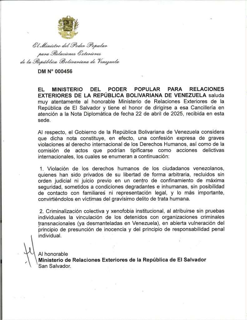 El secuestrador de El Salvador, Nayib Bukele, no solamente dijo en redes sociales que proponía “intercambiar” a los migrantes secuestrados en el Cecot por “presos políticos” venezolanos, sino que mandó una carta formal al gobienro de Venezuela. Fuera de que con ese acto, de hecho reconoce al gobierno de Maduro, que él afirma “no reconocer”, el contenido de la carta, como la declaración de Bukele, lo que hace es evidenciar la violación de derechos humanos que se está cometiendo en El Salvador contra venezolanos. Aquí puedes leer la carta completa de respuesta que le mandó la cancillería venezolana.
