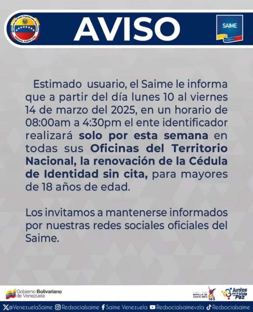 El Servicio Administrativo de Identificación, Migración y Extranjería (Saime), anunció una jornada especial para renovar la cédula de identidad sin necesidad de una cita, a partir de hoy lunes 10 y hasta el viernes 14 de marzo.