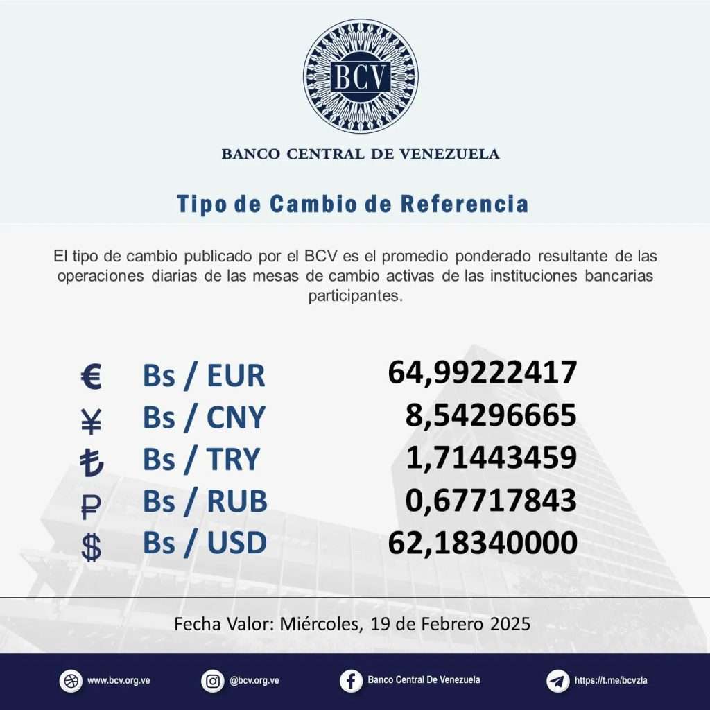 El Banco Central de Venezuela informó que las mesas de cambio de ayer arrojaron un promedio de 62,18 bolívares por dólar. Recuerda que esta es la única tasa válida para cualquier transacción del día de hoy.