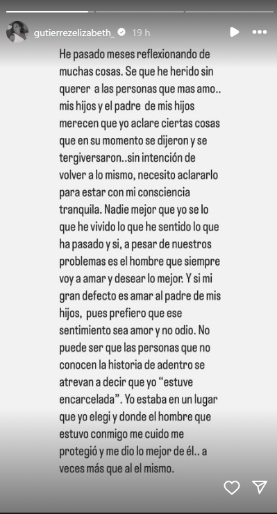 En su reflexión,Elizabeth Gutiérrez aprovechó para desmentir y aclarar algunas afirmaciones que se hicieron en las últimas semanas y que no solo la involucró a ella, sino a toda la familia.