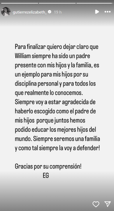 “Quiero dejar claro que William siempre ha sido un padre presente con mis hijos y la familia. Es un ejemplo para mis hijos por su disciplina personal y para todos lo que realmente lo conocemos. Siempre voy a estar agradecida de haberlo escogido como el padre de mis hijos porque juntos hemos podido educar a los mejores hijos del mundo. Siempre seremos una familia y, como tal, siempre la voy a defender”.