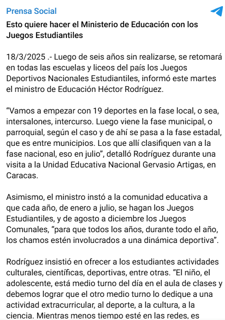 La publicación agregó que el ministro también está trabajando para que en todas las instituciones haya núcleos del movimiento de teatro César Rengifo, Semilleros Científicos, Sociedad Bolivariana, deporte. “Que haya una oferta, institución por institución, para que los niños puedan desarrollar todo su talento”,