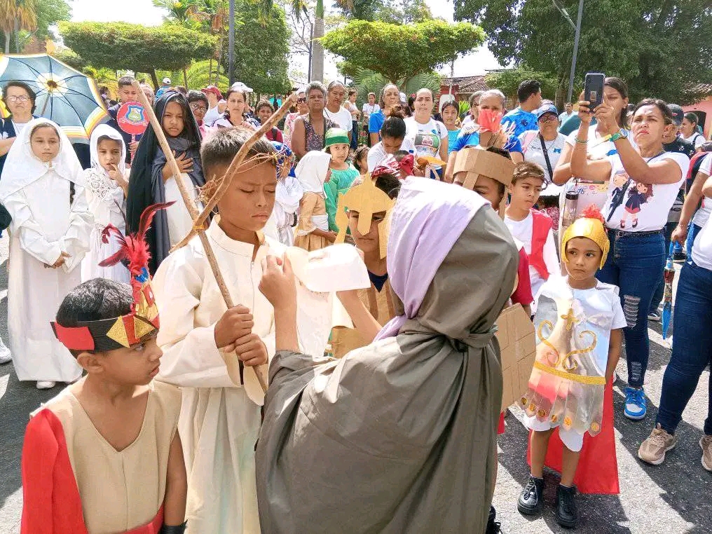 La dramatización de niños, vestidos con la ropa de esa época, en la Pasión de nuestro Señor Jesucristo inició a las 7 a.m. de este viernes, cuando se abrieron las puertas del Santuario Eucaristico Diocesano San Francisco de Paula en Yare. Acompañados del presbítero Jhonfer Camacho, la muchachada recorrió el casco central yarense, donde se colocaron diversas estaciones con motivo de la Semana Mayor.