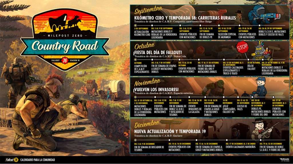 Junto al pase de temporada llamado “Country Road”, Bethesda ha anunciado su roadmap de contenido para los próximos 4 meses, mientras se preparan para su próxima actualización y la Temporada 19.