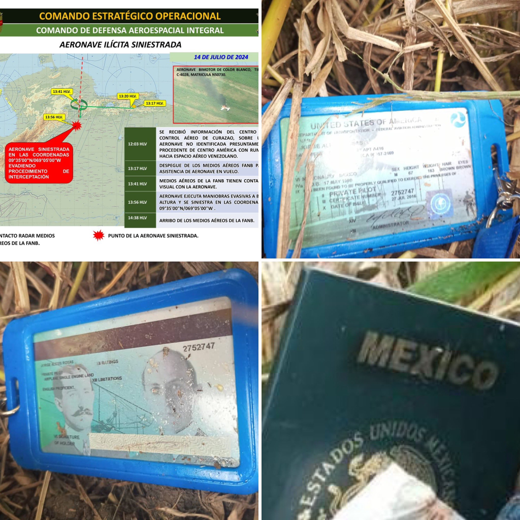 Detalló que se localizó un tripulante fallecido y rastros de interés criminalísticos, como un pasaporte de nacionalidad mexicana y una licencia de vuelo emitida en Estados Unidos, así como otros materiales que vinculan al avión con el narcotráfico.