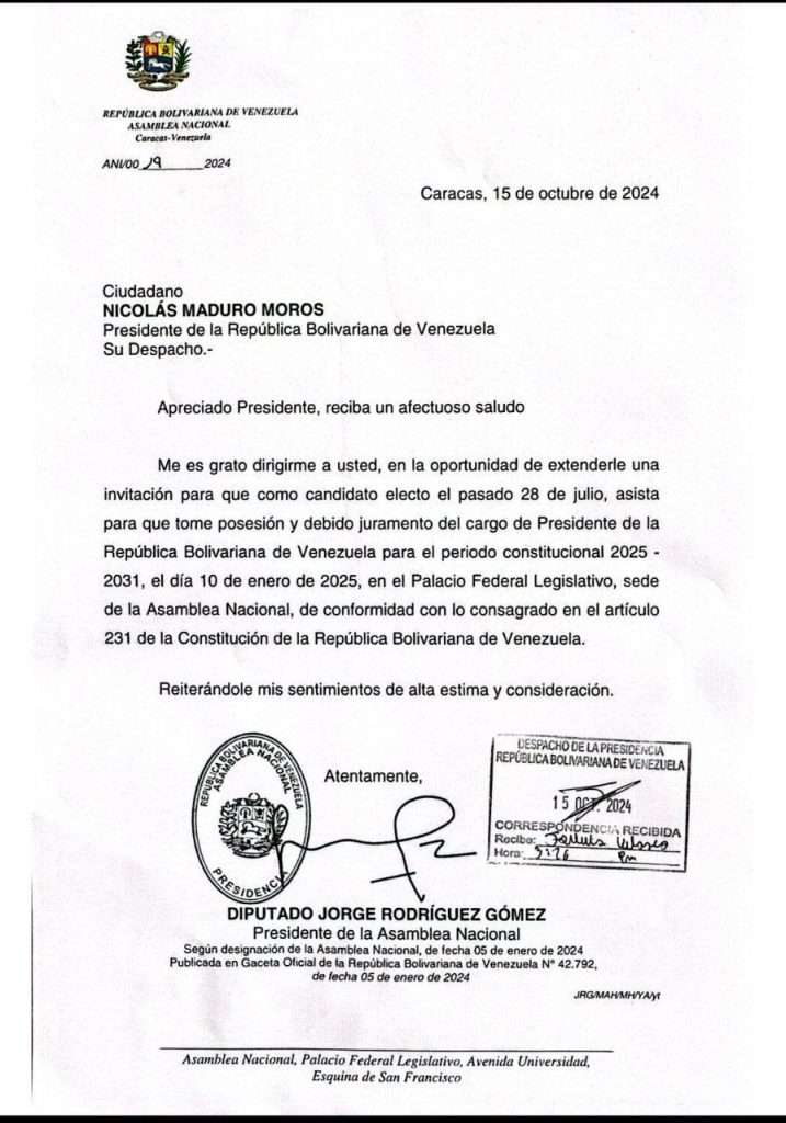 El presiente del parlamento no desaprovechó la oportunidad para mostrar al país la carta de invitación enviada al presidente Nicolás Maduro para que tome posesión, el próximo 10 de enero, ante la plenaria de la AN como jefe de Estado para el periodo 2025-2031, tal y como lo establece la Constitución de la República Bolivariana de Venezuela.
