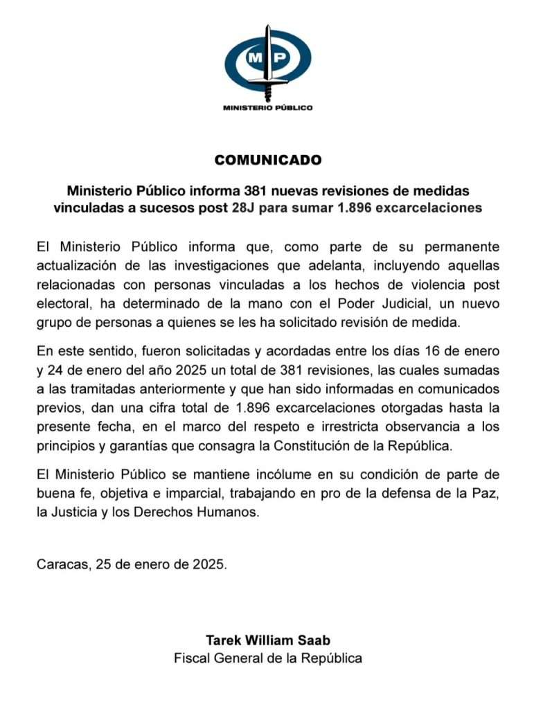 A través de un comunicado el MP informó que fueron solicitadas y acordadas en los días 16 de enero y 24 de enero del año 2025 un total de 381 revisiones, las cuales sumadas a las tramitadas anteriormente y que han sido informadas en comunicados previos, dan una cifra total de 1.896 excarcelaciones otorgadas hasta la presente fecha, en el marco del respeto e irrestricta observancia a los principios y garantías que consagra la Constitución de la República.