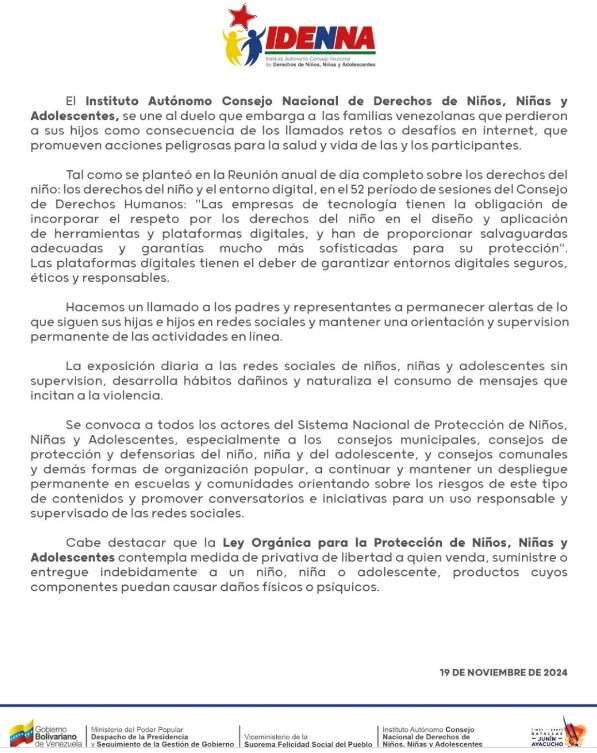 “Se convoca a todos los actores del Sistema Nacional de Protección de Niños, Niñas y Adolescentes, especialmente a los consejos municipales, consejos de protección y defensorías del niño, niña y del adolescente, y consejos comunales y demás formas de organización popular, a continuar y mantener un despliegue permanente en escuelas y comunidades orientando sobre los riesgos de este tipo de contenidos y promover conversatorios e iniciativas para un uso responsable y supervisado de las redes sociales”, refiere el texto difundido a través de su cuenta en la red social Instagram.