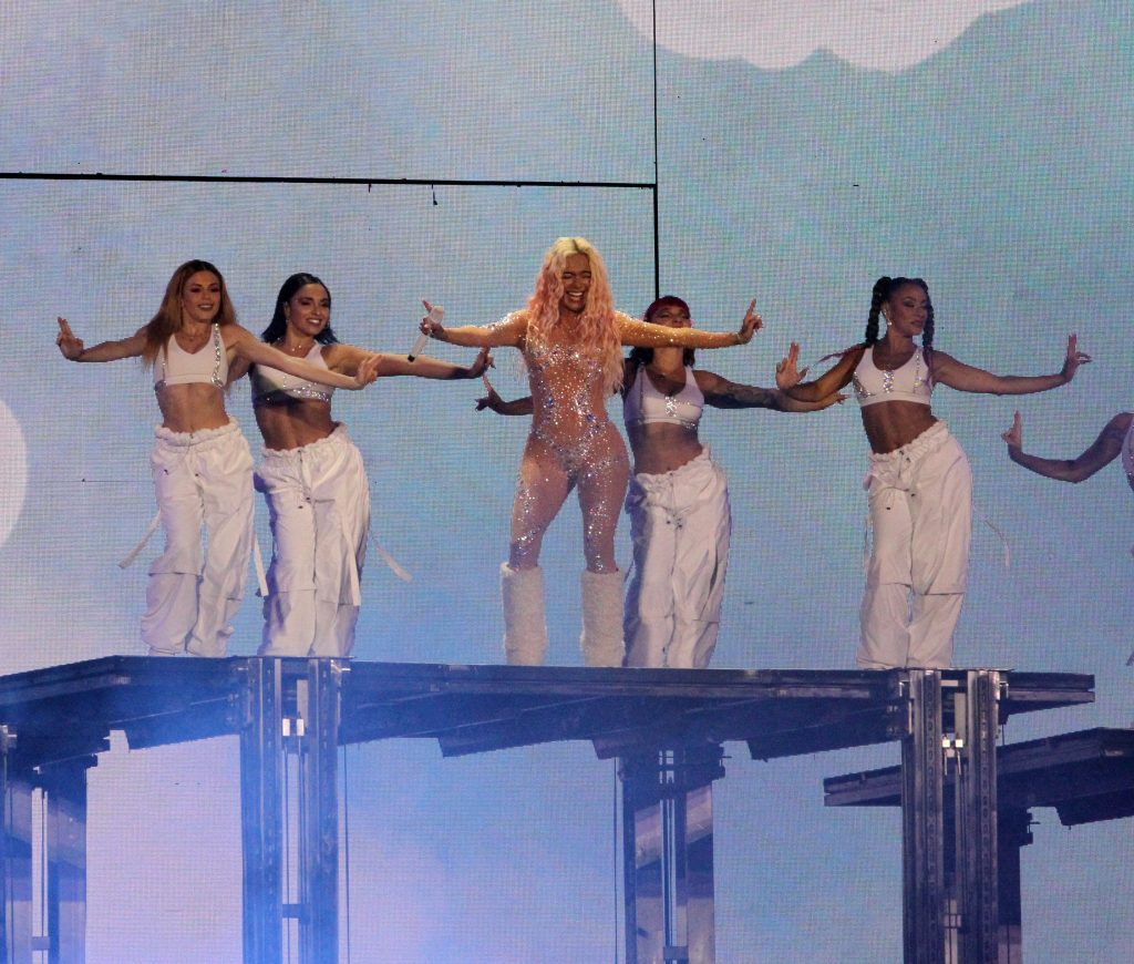 La sirena Carolina y el temido tiburón que la transporta en todas sus fantasías fueron los protagonistas de la primera mitad del espectáculo, en la que la paisa aprovechó de lucir una camisa con la bandera de Venezuela en forma de corazón y una falda con nuestro tricolor. ‘Por si volvemos’, ‘Tusa’, ‘Amargura’ y, claro, ‘Bichota’ fueron las canciones más coreadas de ese apartado.
