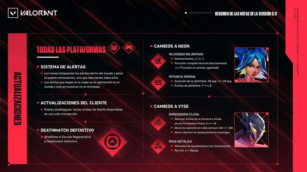 El momento finalmente llegó. Riot Games lanzó el parche 9.11 en Valorant, el último de 2024 con diversos cambios al meta del juego, comenzando por el ya anunciado nerfeo de Neon y el buff para Vyse, así como algunas actualizaciones importantes al sistema de alertas dentro del juego, mejoras a la funcionalidad para potenciar tus diseños de armas y otros ajustes.