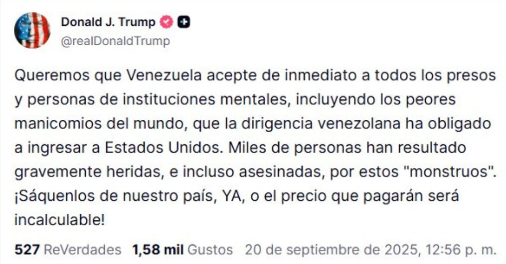 Sin embargo, Trump en su mensaje habló en tono amenazante, como si Venezuela se negara a recibir a sus ciudadanos: “¡Sáquenlos de nuestro país, ahora mismo, o el precio que pagarán será incalculable!”. Parece que quisiera hacer ver que si se llegara a aumentar el volumen de las repatriaciones eso sería porque él lo dijo así todo malote.