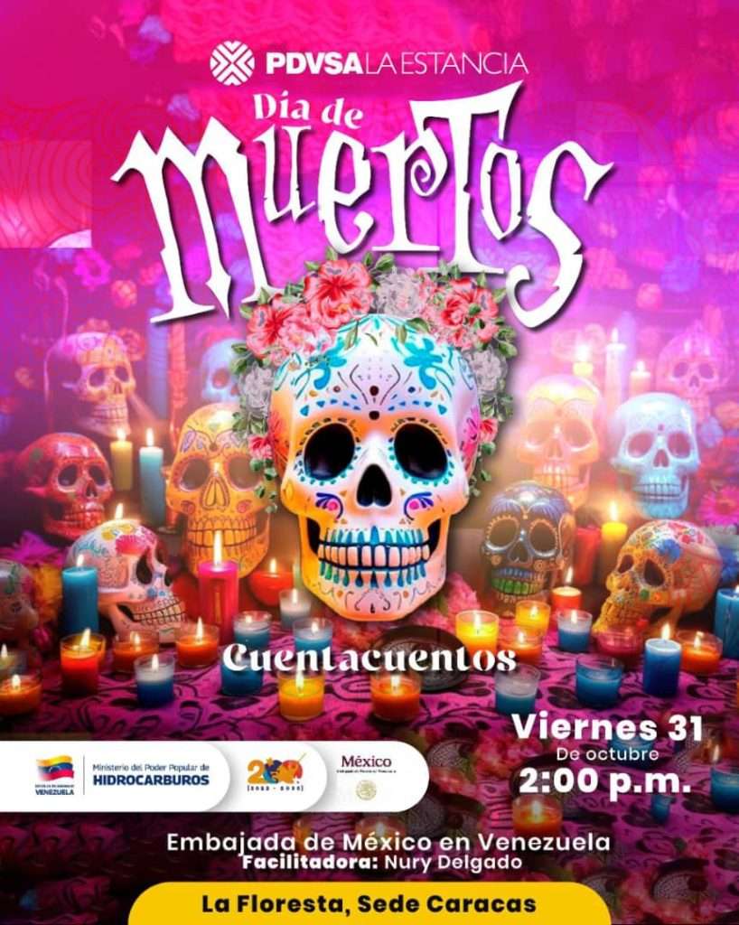 A las 2:00 pm continúa la agenda con un cuento alusivo a la tradición mexicana que ofrece la Embajada de México en Venezuela con su cuentacuentos Nury Delgado. Esta actividad es especial para niñas y niños y contará con la presencia de Ismael Hernández, Agregado Cultural de México en Venezuela, quien disertará sobre los orígenes de la festividad.