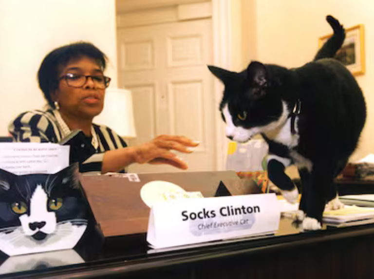 Como buen gato, se robó las miradas, posando en el atril de la sala de prensa, caminando con aires de grandeza (como su naturaleza gatuna) sobre el escritorio de Betty Currie, quien era la secretaria personal del presidente de la época, Bill Clinton.