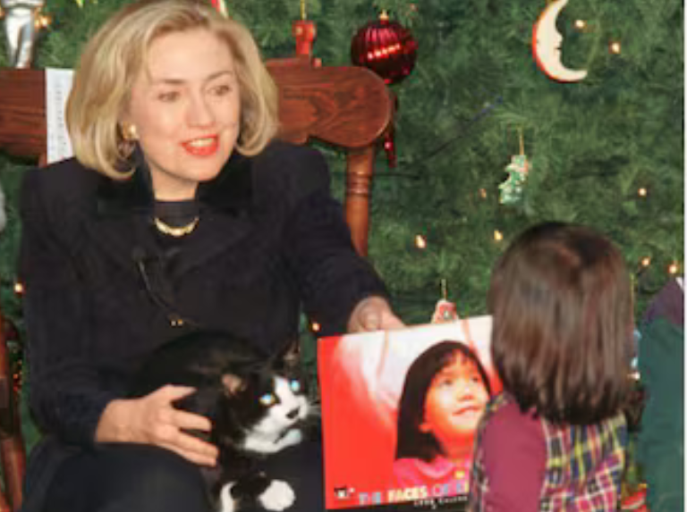 En la gráfica, Socks se encuentra en el regazo de Hillary Clinton en una de sus visitas a un hospital
