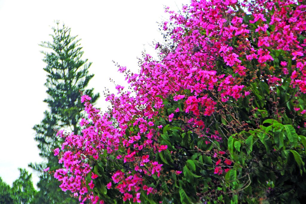 El otro árbol que ya comienza a observarse es reina de las flores (Lagerstroemia speciosa), aunque es de tamaño pequeño o mediano, no más de 20 m. Es originario de Filipinas y la India. Sus flores, cuyos colores van del blanco al púrpura, son panículas erguidas de 20 a 40 centímetros de largo, de seis pétalos.