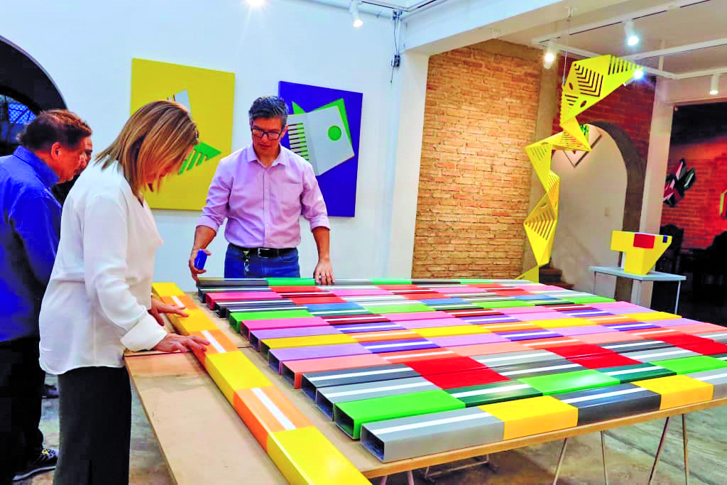 “Cuando esté una frente a la otra van a ocurrir tomas de reflejo de imágenes de un lado y del otro lado y, cuando se desplace el espectador, después de ver directamente las armonías que ocurren con los colores puros, tres cálidos y tres fríos (rojo, anaranjado, amarillo, verde, azul y violeta), acompañados con rayas blancas, van a aparecer tres grises, blanco y negro, que van a estar pintados detrás de los tubulares. Esos se van a reflejar en estos elementos reflectantes y habrá una conjugación entre ellos”, explica detalladamente el maestro.
