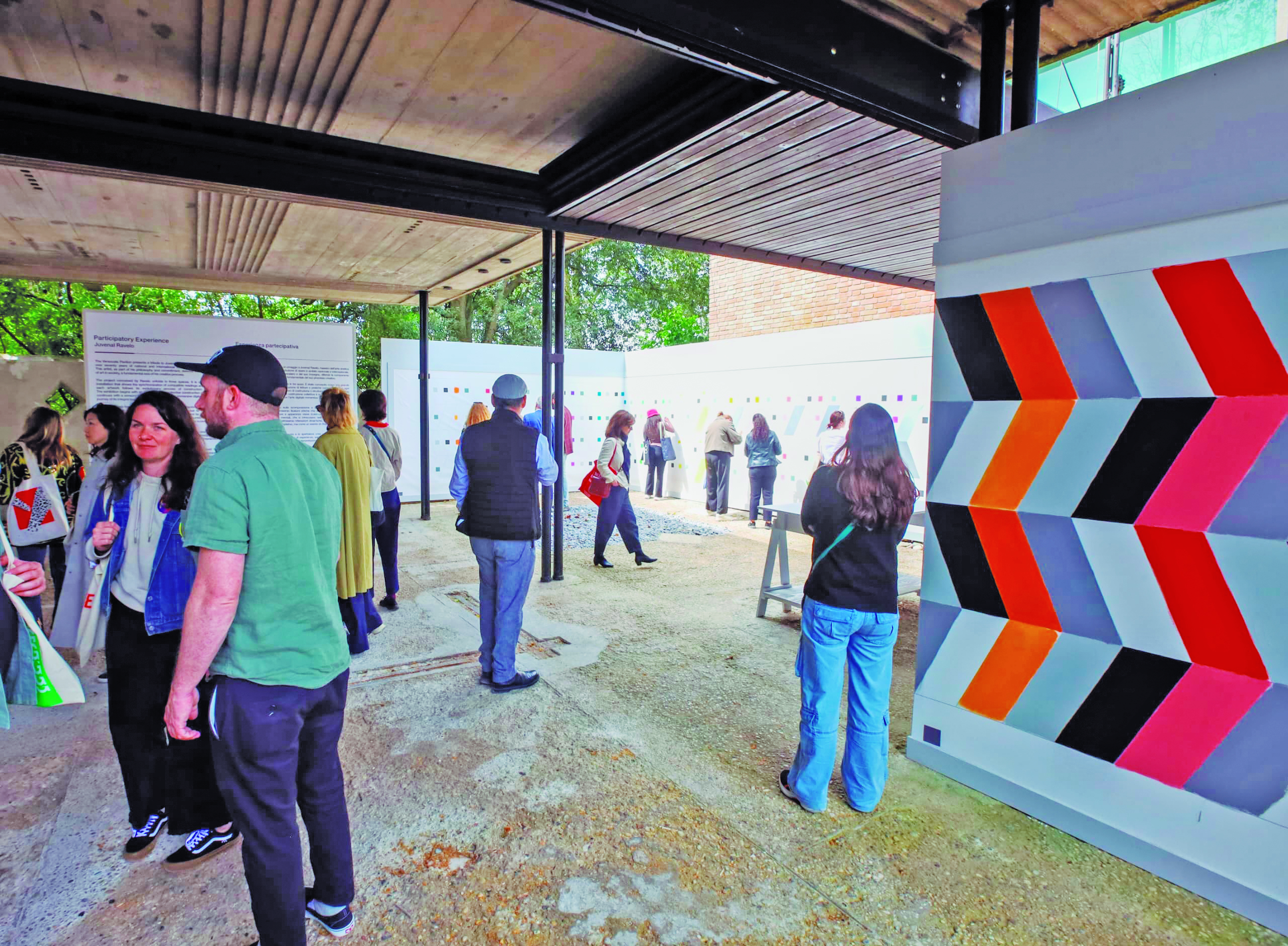 La primera oferta artística del pabellón es un mural, que forma parte del lenguaje plástico de Ravelo y que se basa en la fragmentación del color, aunque esta vez no utiliza elementos reflectantes, pues será pintado por el público.