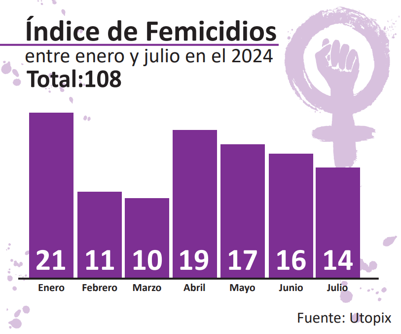 Así lo informó la coordinadora de Monitor de Femicidios Utopix, Aime Zambrano, quien destacó que 108 mujeres fueron asesinadas por sus parejas o exparejas entre enero y julio de 2024 y en su mayoría cometidos con ensañamiento y violencia desmedida.