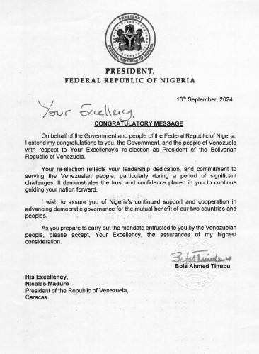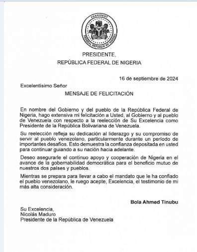 Sus palabras de agradecimiento están acompañadas de la misiva enviada por Bola Ahmed Tinubu en inglés y una en traducción en español, en la que expresó sus felicitaciones al Gobierno de Maduro y al pueblo venezolano por “la reelección de su Excelencia como presidente de la República Bolivariana de Venezuela”.